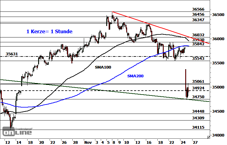 Solange das Supportcluster bei aktuell 34.693-34.758 Punkten nicht signifikant unterboten wird, erscheint eine deutlichere technische Erholungsbewegung mit Blick auf die überverkauften markttechnischen Indikatoren gut vorstellbar. Ein Stundenschluss über der aktuellen Widerstandszone bei 35.061/35.178 Punkten würde mögliche Ziele bei 35.443 Punkten und 35.543-35.658 Punkten in den Blick rücken. Der übergeordnete Abwärtstrend würde erst mit einem Anstieg über die kritische Zone bei derzeit 35.842-36.040 Punkten in Frage gestellt. Ein signifikanter Rutsch unter 34.693 Punkte würde hingegen eine unmittelbare Fortsetzung des Abverkaufs in Richtung zunächst 34.448 Punkte und 34.309/34.331 Punkte nahelegen.