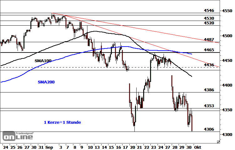 Angesichts der kurzfristig überverkauften markttechnischen Indikatoren käme eine Stabilisierung oder technische Erholung ausgehend vom erreichten Support nicht überraschend. Nächster Widerstand befindet sich bei 4.348/4.353 Punkten. Mit einem Anstieg über diese Hürde würden weitere potenzielle Erholungsziele bei 4.367 Punkten, 4.386 Punkten und 4.400/4.405 Punkten in den charttechnischen Fokus rücken. Weitere Widerstandsbereiche lauten 4.430/4.436 Punkte und 4.454-4.465 Punkte. Erst mit einem Anstieg über die letztgenannte Zone würde der korrektive Abwärtstrend vom Rekordhoch bei 4.546 Punkten in Frage gestellt. Mit einer nachhaltigen Verletzung des aktuellen Supports bei 4.306 Punkten per Stundenschluss würde dieser Abwärtstrend bestätigt mit möglichen nächsten Zielen bei 4.263 Punkten und 4.233/4.245 Punkten.