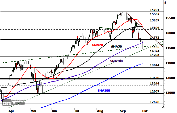 Der Nasdaq 100 setzte seinen Abverkauf vom Rekordhoch bei 15.701 Punkten in den vergangenen Handelstagen fort und markierte im gestrigen Handel ein 4-Monats-Tief bei 14.385 Punkten.