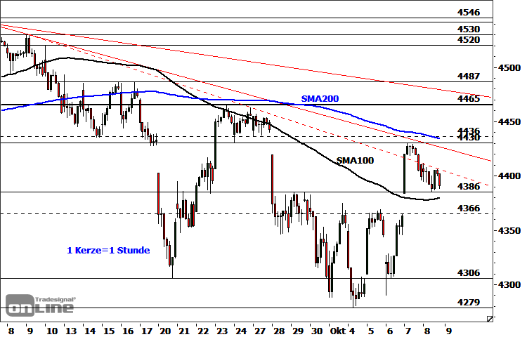 Der mittelfristige Abwärtstrend vom Rekordhoch bleibt intakt. Der gesehene Kursanstieg führte jedoch zu einer Aufhellung des kurzfristigen Chartbildes. Als kurzfristig kritisch ist nun die Unterstützungszone bei 4.366-4.386 Punkten anzusehen. Können die Bullen dieses Niveau per Tagesschluss verteidigen, bleiben die Chancen auf eine zeitnahe Fortsetzung der Erholungsrally erhalten. Nächste Widerstände lauten 4.406 Punkte und 4.426-4.436 Punkte. Ein Stundenschluss darüber würde für einen fortgesetzten Anstieg an die mittelfristig kritische Hürde bei 4.465-4.487 Punkte sprechen. Darüber entstünde schließlich ein Indiz für ein Ende des korrektiven Abwärtstrends und einen erneuten Vorstoß in Richtung 4.546 Punkte. Unterhalb von 4.366 Punkten wäre hingegen ein nochmaliger Kursrutsch in Richtung 4.306 Punkte und 4.279 Punkte einzuplanen.