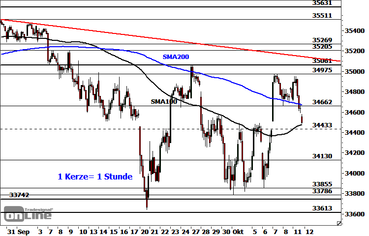 Bislang kann die jüngste Kursschwäche noch als bloßer Pullback an das Ausbruchsniveau der Stauzone gewertet werden. Kritisch ist das Gap bei 34.433 Punkten. Eine nachhaltige Verletzung dieser Marke wäre bearish zu sehen und würde fortgesetzte Abgaben in Richtung 34.130 Punkte und nachfolgend 33.641-33.855 Punkte wahrscheinlich machen. Unterhalb der letztgenannten Zone würde sich das mittelfristige Chartbild deutlicher eintrüben. Eine Dynamisierung der Abwärtskorrektur vom Rekordhoch bei 35.631 Punkten würde in diesem Fall nicht überraschen. Nächste Widerstände lauten 34.662/34.669 Punkte und aktuell 34.950-35.147 Punkte. Mit einem nachhaltigen Anstieg darüber entstünde ein erstes prozyklisches Indiz für ein mögliches Korrekturende.