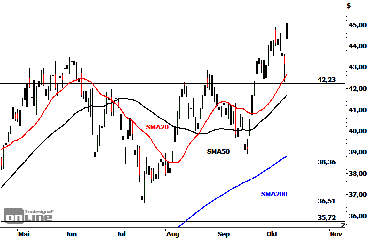 Die Aktie von Bank of America (WKN: 858388) bewegt sich in allen Zeitebenen in einem intakten Aufwärtstrend. Zuletzt hatte der Wert eine mehrmonatige Seitwärtskonsolidierung oberhalb der steigenden 200-Tage-Linie nach oben hin verlassen. Nach einem Rücksetzer auf das Ausbruchsniveau und die steigende 20-Tage-Linie übernahmen gestern die Bullen in Reaktion auf die Veröffentlichung positiv aufgenommener Quartalszahlen das Ruder und beförderten die Notierung schwungvoll und begleitet von hohem Handelsvolumen auf ein neues Mehrjahreshoch bei 45,10 USD. Potenzielle nächste Kursziele im Rahmen des damit bestätigten Haussetrends lassen sich bei 45,39/46,16 USD, 47,80 USD und 50,47 USD ausmachen. Kritischer Kurzfrist-Support befindet sich nun bei 41,69-43,49 USD. Ein Tagesschluss darunter würde für eine zeitliche Ausdehnung der im Juni gestarteten Konsolidierung sprechen mit Abwärtsrisiken in Richtung 38/39 USD und eventuell 35,72/36,51 USD.