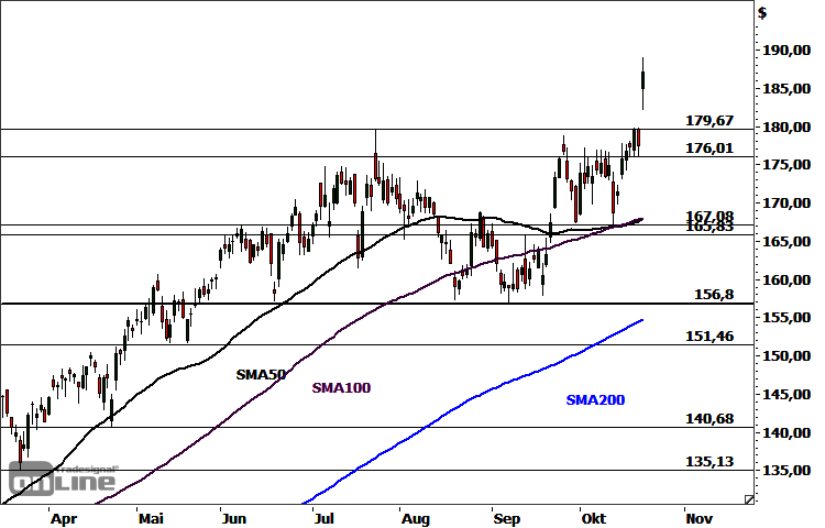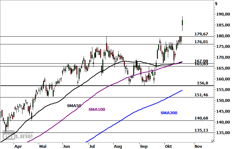 Die Aktie von American Express (WKN: 850226) hatte vom Crash-Tief im März 2020 bei 67,00 USD bis auf ein am 23. Juli markiertes Rekordhoch bei 179,67 USD zulegen können. Die anschließende Korrektur führte die Notierung bis auf 156,80 USD hinab. Zuletzt hatte sie sich wieder in Richtung Allzeithoch vorarbeiten können und knapp darunter eine mehrwöchige Konsolidierung gestartet. In Reaktion auf positiv aufgenommene Quartalszahlen sprang der Wert schließlich am Freitag mit einer Kurslücke und begleitet von sehr hohem Handelsvolumen aus der Stauzone auf eine neue historische Bestmarke. Nächste potenzielle Ziele befinden sich bei 193,80 USD und 202,54 USD. Potenziell unterstützt ist die Aktie im Falle eines Rücksetzers bei 179,67-182,20 USD und 176,01 USD. Ein Rutsch unter die letztgenannte Marke wäre kurzfristig negativ zu werten. Mögliche Auffangbereiche lauten in diesem Fall 165,83-168,72 USD und 156,80-157,95 USD.