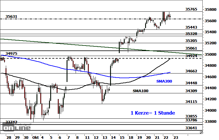 Die Bullen haben weiterhin das Sagen, auch wenn der Ausbruch über das August-Hoch vom Ausmaß her noch nicht als nachhaltig eingestuft werden kann. Sentiment und Saisonalität gestalten sich unterstützend. Nächste potenzielle Ziele befinden sich bei 35.786 Punkten und 36.000-36.216 Punkten. Darüber wäre eine unmittelbare Ausdehnung der Rally in Richtung 36.402 Punkte und 36.586 Punkte vorstellbar. Nächste Unterstützungen lauten 35.534 Punkte, 35.443 Punkte und 35.328/35.364 Punkte. Darunter wäre ein ausgeprägter Pullback in Richtung 34.924-35.061 Punkte zu favorisieren.
