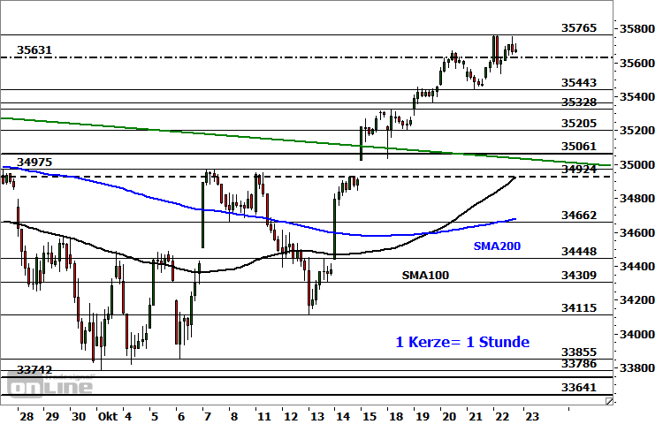 Die Bullen haben weiterhin das Sagen, auch wenn der Ausbruch über das August-Hoch vom Ausmaß her noch nicht als nachhaltig eingestuft werden kann. Sentiment und Saisonalität gestalten sich unterstützend. Nächste potenzielle Ziele befinden sich bei 35.786 Punkten und 36.000-36.216 Punkten. Darüber wäre eine unmittelbare Ausdehnung der Rally in Richtung 36.402 Punkte und 36.586 Punkte vorstellbar. Nächste Unterstützungen lauten 35.534 Punkte, 35.443 Punkte und 35.328/35.364 Punkte. Darunter wäre ein ausgeprägter Pullback in Richtung 34.924-35.061 Punkte zu favorisieren.