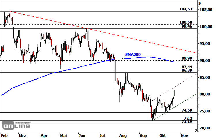 Die Aktie des Videospiele-Anbieters Activision Blizzard (WKN: A0Q4K4) war ausgehend vom zyklischen Tief im Jahr 2019 bei 39,85 USD bis auf ein im Februar dieses Jahres markiertes Allzeithoch bei 104,53 USD angestiegen. Der seither laufende Abwärtstrend korrigierte die Hausse bis an das 50%-Retracement. Vom dort im September verzeichneten Tief bei 72,20 USD läuft aktuell eine bislang dreiwellige Erholungsrally. Mit dem gestrigen dynamischen Kursaufschwung stieß die Notierung an eine wichtige Ziel- und Widerstandszone vor, die sich bis 82,61 USD erstreckt. Mit Blick auf die bullishe Situation beim Handelsvolumen erscheint eine Ausdehnung der Rally gut vorstellbar. Ein Tagesschluss über der aktuellen Hürde würde ein entsprechendes Anschlusssignal senden. Im Fokus stünde im Erfolgsfall zunächst die Region 85,66-86,39 USD. Darüber könnte die Widerstandszone bei 87,44-89,99 USD angesteuert werden. Erst mit einem Break über die mittelfristige Abwärtstrendlinie bei aktuell 93,71 USD entstünde ein prozyklisches Indiz für eine unmittelbare Fortsetzung des langfristigen Aufwärtstrends. Nächste Unterstützungen lauten 78,71-79,04 USD und derzeit 76,29 USD (Erholungstrendlinie). Darunter entstünde ein Warnsignal im Sinne einer Fortsetzung des dominanten Abwärtstrends. Bestätigt würde dieses Szenario unterhalb des Reaktionstiefs bei 74,59 USD sowie mit einem Rutsch unter den auch langfristig bedeutsamen Support bei 71,19/72,20 USD.