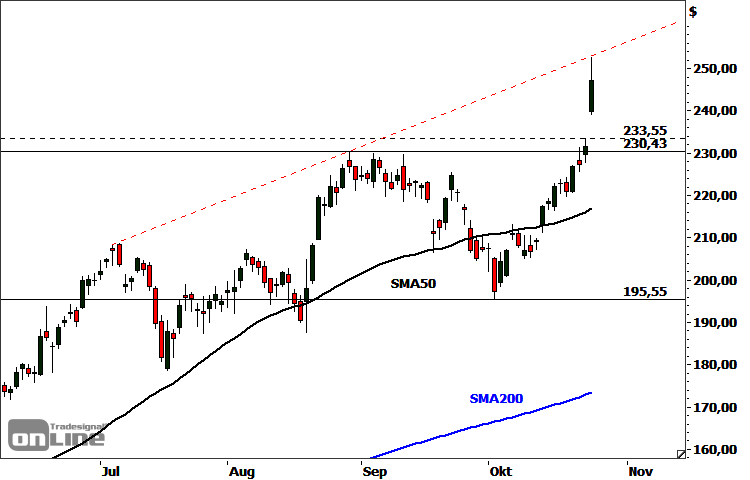 Die NVIDIA-Aktie (WKN: 918422) weist in allen Zeitebenen einen intakten Aufwärtstrend auf. Seit Jahresbeginn konnte das Papier des Chip-Riesen bereits um rund 89 Prozent zulegen. Zum Wochenstart beendete es eine mehrwöchige Korrekturphase mit einem Anstieg über das August-Hoch (230,43 USD) auf ein neues Rekordhoch. Im gestrigen Handel folgten diesem zunächst zaghaften Ausbruch massive Anschlusskäufe. Begleitet von sehr hohem Handelsvolumen riss der Wert eine bullishe Kurslücke und haussierte in der Spitze bis auf 252,59 USD. An der dort befindlichen Ziel- und Widerstandszone setzen moderate Gewinnmitnahmen ein. Die kurzfristig überkaufte Situation in den markttechnischen Indikatoren und die aktuelle Hürde in Gestalt der mittelfristigen Eindämmungslinie und des 161,8%-Fibonacci-Extensionsniveaus machen die Aktie in der kurzen Frist anfällig für eine Konsolidierung oder einen Rücksetzer in Richtung 230,43/233,55 USD. Solange die Notierung nicht nachhaltig darunterfällt (Tagesschlusskursbasis) bleiben die Bullen in einer starken Position. Darunter wäre eine ausgedehnte Korrektur in Richtung 217/221 USD einzuplanen. Das mittelfristige Chartbild würde sich erst unter 195,55 USD eintrüben. Potenzielle nächste Ausdehnungsziele im Rahmen des laufenden Bullenmarktes oberhalb der aktuellen Hürde bei 252/254 USD befinden sich bei 265 USD und 287 USD.