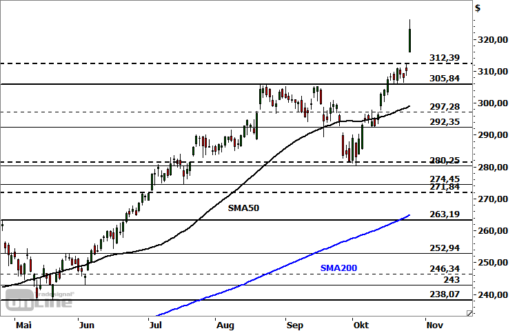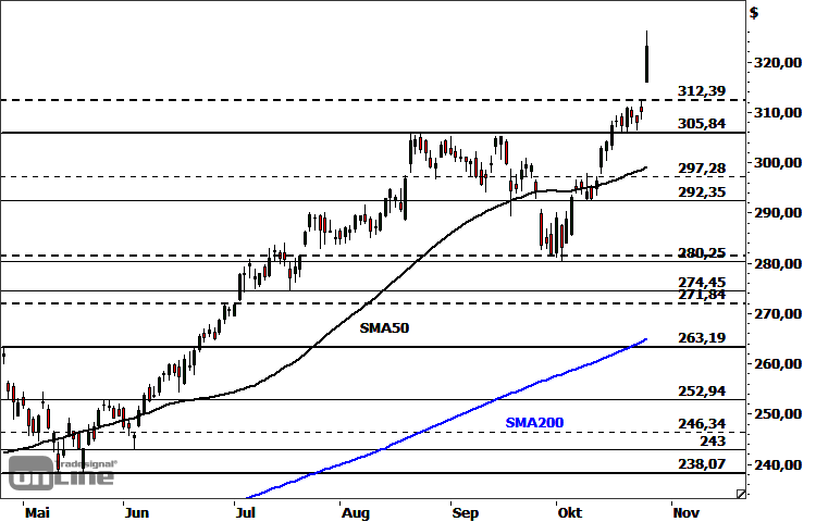 Die Aktie des Softwarekonzerns Microsoft (WKN: 870747) bewegt sich in einem intakten Aufwärtstrend. Ausgehend vom Corona-Crash-Tief im März vergangenen Jahres bei 132,52 USD konnte sie bereits in der Spitze um rund 146 Prozent zulegen. Eine mehrwöchige Korrekturphase hatte das Papier zuletzt mit einem Anstieg auf ein neues Allzeithoch beendet. Die dann oberhalb des August-Hochs (305,84 USD) etablierte mehrtägige Konsolidierung wurde schließlich im gestrigen Handel nach der Veröffentlichung positiv aufgenommener Quartalszahlen mit einer bullishen Kurslücke aufgelöst. Der Wert konnte sich begleitet von hohem Handelsvolumen bis auf eine neue Bestmarke bei 326,10 USD hinaufschrauben. Kurzfristig würde eine Verschnaufpause nach dem kräftigen Kursanstieg und mit Blick auf überkaufte markttechnische Indikatoren nicht überraschen. Das technische Bias in diesem Zeitfenster bleibt unmittelbar bullish, solange die Unterkante der Kurslücke bei 312,39 USD nicht per Tagesschluss unterboten wird. Darunter wäre ein deutlicherer Rücksetzer in Richtung zunächst 305,84 USD und eventuell 297,28-300,00 USD einzuplanen. Potenzielle nächste Kursziele auf der Oberseite lassen sich bei 331,43 USD und 347,24 USD ausmachen.