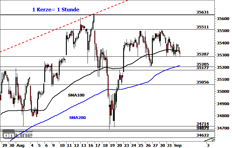 Der Index befindet sich in einer Konsolidierung. Die Ausgangslage für einen bullishen Ausbruch bleibt günstig, solange die Supportzone bei aktuell 35.177-35.212 Punkten nicht nachhaltig unterboten wird. Zwischengeschaltet fungiert der Bereich 35.287-35.300 Punkte als (schwache) Unterstützung. Ein Anstieg über die aktuelle Hürde bei 35.511 Punkten würde bereits die Zone 35.560-35.631 Punkte in den Fokus rücken. Darüber würde schließlich der primäre Aufwärtstrend bestätigt mit nächsten potenziellen Zielen bei 35.787/35.800 Punkten und 35.850-35.923 Punkten. Unterhalb von 35.177 Punkten entstünden hingegen Abwärtsrisiken in Richtung zunächst 35.015/35.056 Punkte. Die Verletzung der letztgenannten Zone würde das Chartbild deutlicher trüben und die steigende 50-Tage-Linie bei derzeit 34.941 Punkten sowie die kurzfristig kritische Unterstützungszone bei 34.673-34.714 Punkten als mögliche Ziele aktivieren.