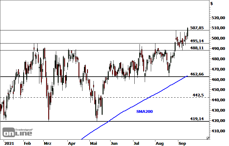 Die Broadcom-Aktie (WKN: A2JG9Z) bewegt sich in allen Zeitebenen in einem intakten Aufwärtstrend. Ausgehend vom im März 2020 verzeichneten Tief bei 155,67 USD war das Papier dynamisch bis auf ein im Februar markiertes Rekordhoch bei 495,14 USD haussiert. Im Rahmen der darunter ausgebildeten Stauzone verdaute der Wert die Rally oberhalb eines Korrekturtiefs bei 419,14 USD. Zuletzt übernahmen die Bullen erneut das Ruder. Im gestrigen Handel schraubte sich die Notierung aus einer mehrtägigen Konsolidierungsspanne bis auf ein neues Allzeithoch bei 510,70 USD und bestätigte damit auch den übergeordneten Haussetrend. Potenzielle nächste Kursziele lauten 515,81 USD, 524,17 USD und 542,11 USD. Mit Blick auf die Unterseite ist der Supportbereich 488,11-495,14 USD kurzfristig kritisch. Solange er nicht nachhaltig (Tagesschlusskursbasis) unterboten wird, weist der Weg des geringsten Widerstands weiterhin nordwärts. Darunter wäre eine Abwärtskorrektur in Richtung 463-472 USD einzuplanen.