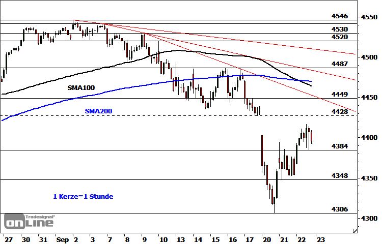 Im Fokus steht nun die aktuelle Widerstandszone bei 4.417-4.428 Punkten. Ein dynamischer Anstieg darüber, insbesondere per Tagesschluss, würde das kurzfristige Chartbild leicht aufhellen und eine Ausdehnung des Erholungstrends in Richtung 4.449-4.454 Punkte oder 4.464-4.487 Punkte ermöglichen. Solange die letztgenannte Zone nicht nachhaltig geknackt wird, bleibt die Wahrscheinlichkeit für eine anschließende Fortsetzung des korrektiven Abwärtstrends vom Rekordhoch bei 4.546 Punkten hoch. Eine erste Bestätigung für dieses bearishe Szenario läge in einem Rutsch unter den Support bei 4.348/4.353 Punkten. Darunter dürfte das Tief bei 4.306 Punkten angesteuert werden, dessen nachhaltige Unterschreitung ein Anschlussverkaufssignal mit nächstem Ziel 4.233 Punkte generieren würde.