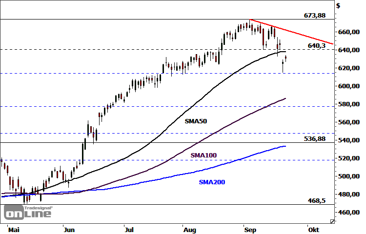 Die Aktie des Softwarekonzerns Adobe (WKN: 871981) weist einen intakten langfristigen Aufwärtstrend auf. Die dynamische Hausse beförderte sie bis auf ein am 3. September bei 673,88 USD markiertes Rekordhoch. Seither befindet sie sich im Korrekturmodus. Der korrektive Abwärtstrend nahm zuletzt deutlich an Fahrt auf. Mit einer bearishen Kurslücke und begleitet von hohem Handelsvolumen rutschte der Wert nach der Vorlage von Geschäftszahlen unter die 50-Tage-Linie bis auf ein 7-Wochen-Tief bei 615,06 USD. Ausgehend von dieser Unterstützungszone startete eine Erholungsbewegung. Als kurzfristig kritisch ist nun die Widerstandszone bei 638,37-640,30 USD anzusehen. Solange es nicht zu einem signifikanten Tagesschluss darüber kommt, bleibt die Wahrscheinlichkeit für eine anschließende Ausdehnung der Abwärtskorrektur hoch. Bestätigend hierfür wäre eine nachhaltige Verletzung der Supportzone bei 610,64-615,06 USD per Tagesschluss. Potenzielle Abwärtsziele lauten dann 577/586 USD und 533-553 USD. Oberhalb von 640,30 USD würde hingegen zunächst ein Vorstoß in Richtung 654-662 USD möglich. Erst darüber entstünde ein prozyklisches Signal für eine unmittelbare Fortsetzung des übergeordneten Aufwärtstrends.