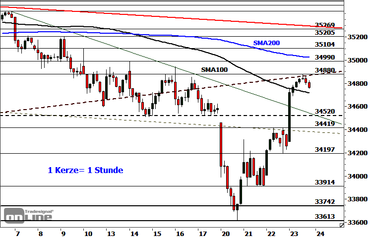 Sowohl der ganz kurzfristige Erholungstrend, als auch der übergeordnete korrektive Abwärtstrend vom Rekordhoch bei 35.631 Punkten sind intakt. Neue Signale bleiben abzuwarten. Ein signifikanter Anstieg über 34.880 Punkte würde eine Rally-Ausdehnung in Richtung 34.990-35.024 Punkte ermöglichen. Darüber würde sich das kurzfristige Bild weiter aufhellen mit möglichen Zielen bei 35.104 Punkten, 35.205 Punkten und 35.269-35.300 Punkten. Auf der Unterseite stellen die Bereiche 34.650/34.719 Punkte, 34.419 Punkte und 34.197 Punkte nächste Unterstützungen dar. Unterhalb der letztgenannten Marke würde eine unmittelbare Wiederaufnahme des Abwärtstrends wahrscheinlich.