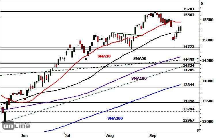 Die technische Ausgangslage hat sich mit zwei Tagesschlusskursen oberhalb der Kurslücke bei 15.291 Punkten sowie oberhalb der zurückeroberten 50-Tage-Linie entspannt. Mit einem Anstieg über die aktuelle Hürde bei 15.357 Punkten würde eine Fortsetzung der Erholung bis zunächst 15.441 Punkte indiziert. Unmittelbar bullish würde es mit einem nachhaltigen Break (Tagesschlusskursbasis) über die Zone 15.539-15.562 Punkte. Dann mit nächsten Ziel Rekordhoch bei 15.701 Punkten. Unterstützt ist der Index aktuell bei 15.199/15.209 Punkten. Eine nachhaltige Verletzung dieser Zone würde bereits wieder ein Warnsignal für die Bullen senden. Weitere Unterstützungen lauten dann 15.107 Punkte und 14.987/15.017 Punkte. Darunter wäre schließlich ein erneuter Test der mittelfristig relevanten Supportzone bei 14.773/14.821 Punkten zu erwarten.