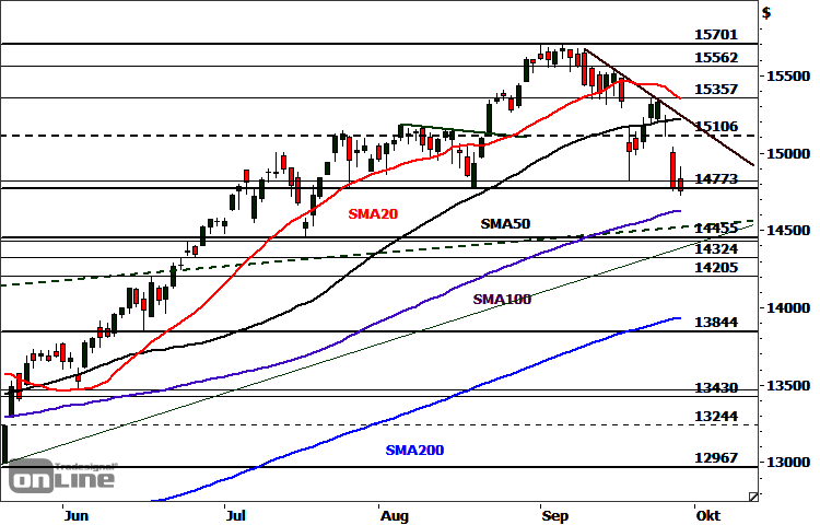 Der Nasdaq 100 konnte seine Erholungsrally nach der Rückeroberung der 50-Tage-Linie und der Kurslücke vom 20. September nicht ausdehnen. Stattdessen verletzte er die Supportzone bei 15.199/15.209 Punkten, was zur erneuten Machtübernahme durch die Bären führte. Der massive Kursrutsch am Dienstag ließ die Notierung anschließend bis an die mittelfristig relevante Unterstützung bei 14.773/14.821 Punkten absacken. Dort zeigte der Index zuletzt einen Stabilisierungsversuch und schloss gestern knapp unterhalb dieser Zone.