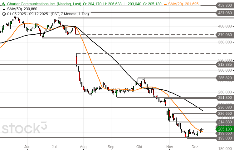 Die Aktie von Charter Communications (WKN: A2AJX9) bewegt sich ausgehend vom im Jahr 2021 bei 825,62 USD markierten Rekordhoch in einem primären Abwärtstrend. Zuletzt verbuchte sie am 20. November ein Mehrjahrestief bei 193,00 USD. Seither versucht der Wert oberhalb dieser Marke einen Boden auszubilden. Am 5. Dezember gelang die Überwindung der 20-Tage-Linie. Aktuell konsolidiert der Anteilsschein diesen Ausbruch seitwärts. Ein bullishes Anschlusssignal im kurzfristigen Zeitfenster entstünde nun mit einem Ausbruch über das Konsolidierungshoch bei 207,79 USD. Im Erfolgsfall würde die Zone 212,58-214,83 USD als mögliches Erholungsziel aktiviert. Oberhalb dieser Barriere (Tagesschlusskursbasis) entstünde die Aussicht auf weitere Kursavancen in Richtung 225,15-226,65 USD und eventuell 226,08 USD. Ein Tagesschluss unterhalb der aktuellen Supportzone bei 199,65-201,70 USD würde derweil bereits ein Warnsignal für das Erholungsszenario liefern. Unmittelbar bearish würde es wieder unterhalb der Unterstützung bei 193,00-194,02 USD mit einem möglichen nächsten Zielbereich bei aktuell 175,81-184,70 USD.