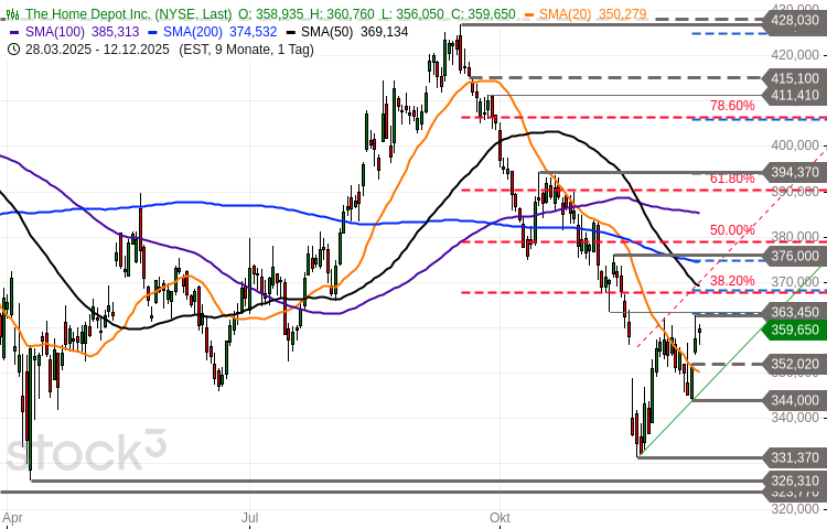 Die Aktie der weltgrößten Baumarktkette Home Depot (WKN: 866953) hatte im November 2024 ein Allzeithoch bei 439,37 USD verbucht und befindet sich seither in einer ausgeprägten Seitwärtskorrektur. Mit Blick auf das mittelfristige Chartbild hatte der Wert vom Zwischenhoch im September (426,75 USD) einen Kursrutsch bis auf im November gesehene 331,37 USD vollzogen und damit nahezu das untere Ende der etablierten Stauzone erreicht. Nach einer ersten Erholungswelle und einem anschließenden Rücksetzer strebt die Notierung nach der Ausformung einer Bullish-Engulfing-Tageskerze am 10. Dezember wieder nordwärts. Die laufende zweite Erholungswelle kann sich zeitnah in Richtung 367,81-371,14 USD und 374,53-379,06 USD ausdehnen, solange nicht zuvor die Unterstützung bei aktuell 350,28-353,94 USD per Tagesschluss verletzt wird. Eine Bestätigung für das bullishe Szenario könnte in einem Break über die derzeitige Hürde bei 362,29-363,45 USD gesehen werden. Weiter aufhellen würde sich das Bild oberhalb von 390,32-394,37 USD mit Zielrichtung 420,61-439,37 USD. Ein Rutsch unter 344,00 USD per Tagesschluss würde derweil unmittelbar ein bearishes Signal senden und Risiken in Richtung zunächst 331,37 USD und 323,77/326,31 USD mit sich bringen.