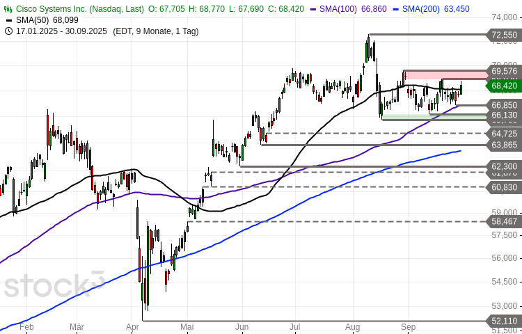 Die Aktie des Netzwerkausrüsters Cisco Systems (WKN: 878841) hatte im Oktober 2022 ein 2-Jahres-Tief bei 38,61 USD markiert. Der dort gestartete langfristige Aufwärtstrend ist intakt. Ausgehend vom am 11. August bei 72,55 USD verbuchten Dekadenhoch startete eine Abwärtskorrektur, die zuletzt oberhalb des Tiefs bei 65,75 USD in eine Seitwärtspendelbewegung einschwenkte. Das kurz- bis mittelfristige technische Bias ist noch neutral. Ein nachhaltiger Break über die Hürde bei 68,92-69,58 USD wäre bullish zu werten mit einem möglichen nächsten Ziel bei 72,55 USD. Darüber würde der übergeordnete Aufwärtstrend bestätigt mit potenziellen Ausdehnungszielen bei 74,40/75,15 USD, 76,75 USD und 80,89/82,00 USD. Ein Rutsch unter den Support bei 65,75 USD wäre derweil bearish mit nächstem Ziel bei 63,45-63,93 USD.