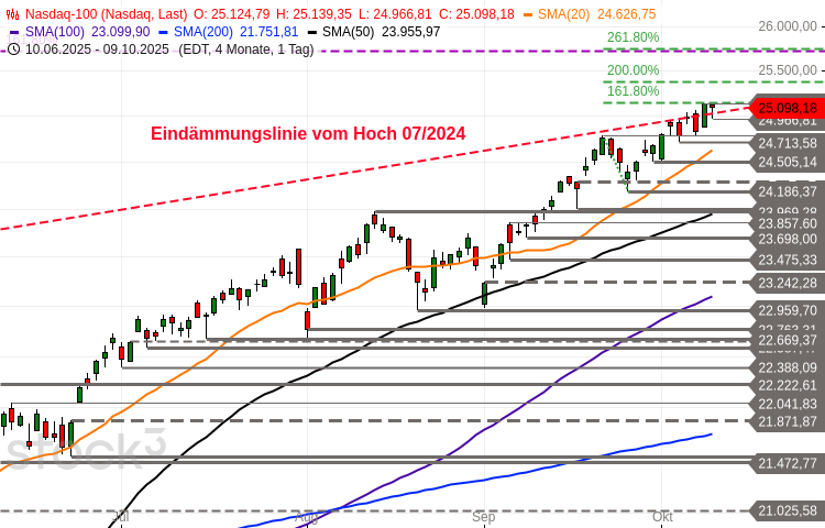 Der Nasdaq 100 konnte sich bis auf ein am Mittwoch bei 25.142 Punkten verbuchtes Rekordhoch hinaufarbeiten. Damit gelang der Ausbruch über die Eindämmungslinie vom Hoch im Juli 2024. Im gestrigen Handel formte der Index einen Inside Day (Handelsspanne komplett in der Range des Vortages).
