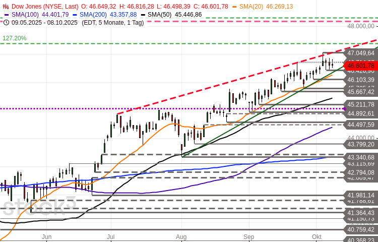 Der Dow Jones Industrial verzeichnete am 3. Oktober ein Rekordhoch bei 47.050 Punkten. Die darunter etablierte Konsolidierung mit einem Tief bei 46.427 Punkten setzte sich auch gestern fort.