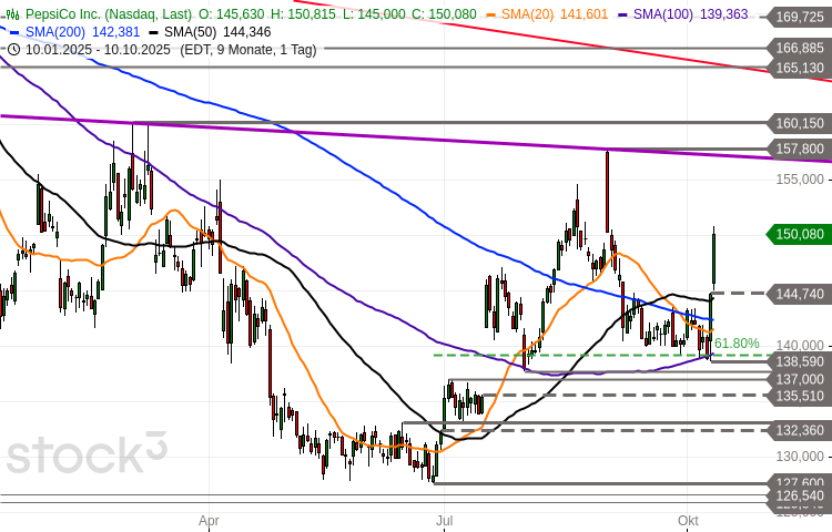 Die Aktie von PepsiCo (WKN: 851995) hatte im Mai 2023 ein Rekordhoch bei 196,88 USD erzielt und startete anschließend einen weiterhin intakten übergeordneten Abwärtstrend. Im Bereich einer langfristig bedeutsamen Unterstützungszone konnte sie oberhalb des am 26. Juni dieses Jahres bei 127,60 USD verzeichneten Mehrjahrestiefs einen mehrwöchigen Boden ausbilden und am 1. Juli komplettieren. Die nachfolgende Rally katapultierte den Anteilsschein bis auf 157,80 USD. Der anschließende Rücksetzer traf in der vergangenen Woche im Bereich des Supportclusters aus 100-Tage-Linie und 61,8%-Fibonacci-Retracement auf Kaufinteresse. Begleitet von hohem Volumen konnte sich der Wert dynamisch nach oben absetzen und vom Tief am Donnerstag in der Spitze rund 9% zulegen. Nächste relevante Widerstände befinden sich bei 150,46 USD, 153,27/153,69 USD und 157,25-157,80 USD. Die nachhaltige Überwindung der letztgenannten Zone per Tagesschluss würde eine übergeordnete Bodenbildung in Gestalt einer inversen Kopf-Schulter bestätigen. Im Erfolgsfall lauten nächste potenzielle Ziele und Barrieren 160,15 USD, 165,13-169,73 USD, 177,50 USD, 180,91 USD und 183,41-187,45 USD. Eine nächste potenzielle Unterstützung für die Preiskurve lässt sich bei 144,35-146,15 USD ausmachen. Die Bullen bleiben in einer starken Position, solange diese Zone im Fall eines Pullbacks nicht per Tagesschluss unterboten wird. Darunter wäre mit einem ernsthaften erneuten Test der mittelfristig kritischen Supportzone bei 138,59-142,38 USD zu rechnen.