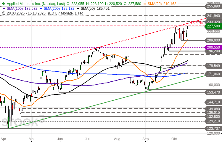 Die Aktie von Applied Materials (WKN: 865177) war ausgehend vom zyklischen Tief im Oktober 2022 bei 71,12 USD bis auf ein im Juli 2024 bei 255,89 USD gesehenes Allzeithoch haussiert. Die anschließende ausgeprägte Korrekturphase drückte sie bis auf ein am 7. April dieses Jahres verbuchtes 2-Jahres-Tief bei 123,74 USD. Der dort gestartete mittelfristige Aufwärtstrend ist intakt. Im Rahmen der im September initiierten zweiten Aufwärtswelle erreichte der Wert im gestrigen Handel das 78,6%-Fibonacci-Retracement des Abschwungs vom Rekordhoch und markierte ein 15-Monats-Hoch. Ein Wermutstropfen für die Bullen stellt mit Blick auf den damit verbundenen Ausbruch aus einer mehrtägigen Konsolidierung das maue Handelsvolumen dar. Zudem signalisieren die Momentumindikatoren einen Verlust an Schwungkraft. Angesichts der gestaffelten Hürden bestehend aus dem genannten Retracement (227,61 USD), der Rückkehrlinie des mittelfristigen Trendkanals (aktuell: 231,92 USD) sowie der Abwärtslücke vom 17. Juli 2024 (233,32-241,94 USD) sollten die Stops bestehender Long-Positionen zur Gewinnsicherung engmaschig nachgezogen werden. Oberhalb von 241,94 USD (Tagesschlusskursbasis) würde das Allzeithoch bei 255,89 USD als nächstes potenzielles Ziel aktiviert. Ein Tagesschlusskurs unterhalb von 217,75 USD sowie ein Intraday-Rutsch unter 209,00/210,16 USD würden nun den möglichen Start einer deutlicheren Verschnaufpause indizieren. Als potenzielle Auffangbereiche fungieren in diesem Fall die Kursregion 196,20-200,55 USD sowie die steigende 50-Tage-Linie bei derzeit 185,45 USD.