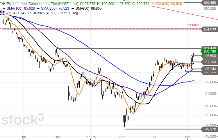 Die Aktie von Estée Lauder (WKN: 897933) war von einem im Januar 2022 bei 374,20 USD markierten Rekordhoch bis auf ein im April dieses Jahres bei 48,37 USD verzeichnetes 14-Jahres-Tief eingebrochen. Hiervon ausgehend etablierte sie einen mittelfristigen Aufwärtstrend. Dieser Kursschub wurde zuletzt von einer ausgeprägten Seitwärtskorrektur unterbrochen. Am vergangenen Freitag gelang schließlich der dynamische Ausbruch aus der Stauzone auf ein 13-Monats-Hoch. Als potenzielle nächste Ausdehnungsziele für die Rally fungieren die Bereiche 103,10/103,44 USD, 104,77 USD, 107,82 USD und 109,88 USD. In der mittleren Frist könnte das 23,6%-Fibonacci-Retracement der Baisse bei 125,27 USD angesteuert werden. Mit Blick auf die Unterseite lassen sich nächste Supportbereiche bei 95,47/96,50 USD und 89,87-91,10 USD ausmachen. Die Bullen bleiben in einer starken Position, solange die letztgenannte Zone nicht per Tagesschluss unterboten wird. Darunter wäre ein neuerlicher Test der mittelfristig kritischen Supportzone 83,12-85,63 USD einzuplanen.