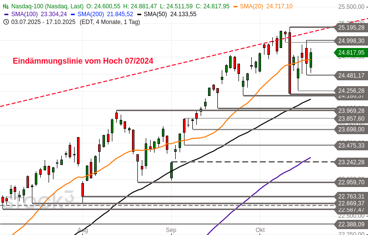 Die technische Ausgangslage gestaltet sich in der kurzen Frist neutral. Zur Generierung eines bullishen Signals bedarf es der Überwindung der Hürde bei 24.269-24.998 Punkten. Im Erfolgsfall würde das Rekordhoch bei 25.195 Punkten als mögliches Ziel aktiviert. Dessen nachhaltige Überschreitung per Tagesschluss würde den übergeordneten Haussetrend bestätigen und nächste Ausdehnungsziele bei 25.377 Punkten und 25.464-25.603 Punkten in den Fokus rücken. Kurzfristig kritisch erscheint der Support bei 24.481-24.565 Punkten. Dessen signifikante Verletzung insbesondere per Tagesschluss würde für einen neuerlichen Test der Supportzone bei derzeit 24.134-24.256 Punkten sprechen.