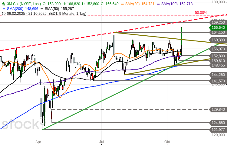 Die Aktie des US-Industriekonzerns 3M (WKN: 851745) hatte mit der Herausnahme des Widerstands bei 110,66-113,14 USD am 26. Juli 2024 einen langfristigen Boden komplettiert. Der primäre Aufwärtstrend wurde zuletzt im mittelfristigen Zeitfenster unterbrochen von einer Seitwärtskorrektur in Gestalt eines symmetrischen Dreiecks. Der gestrige Handel führte schließlich nach der Veröffentlichung der Quartalszahlen zu einem von hohem Volumen begleiteten Ausbruch aus dem Dreieck auf ein 3-Jahres-Hoch bei 166,82 USD. Das Ausbruchssignal spricht für weitere Kursavancen in Richtung zunächst 169,25-172,56 USD und nachfolgend 181,00-183,80 USD. Mögliche Rücksetzer würden nun auf potenzielle Unterstützungen bei 164,15 USD, 160,39 USD und 152,80-156,27 USD treffen. Das Chartbild bleibt bullish, solange die letztgenannte Zone nicht per Tagesschluss unterboten wird.