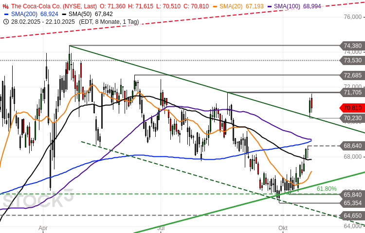 Die Coca-Cola-Aktie (WKN: 850663) bewegt sich in einem intakten langfristigen Aufwärtstrend. Vom zyklischen Tief bei 51,55 USD im Oktober 2023 konnte sie bis auf ein im April dieses Jahres bei 74,38 USD gesehenes Allzeithoch haussieren. Die nachfolgende Korrektur führte das Papier bis Ende September zurück an die Kreuzunterstützung resultierend aus der primären Trendlinie und dem 61,8%-Fibonacci-Retracement des letzten Kursschubes vom Januar-Tief. Seither befinden sich die Bullen wieder am Ruder. Sie beförderten den Anteilsschein über alle gleitenden Durchschnittslinien und schließlich am 21. Oktober in Reaktion auf die Veröffentlichung der Quartalszahlen per Kurslücke über die korrektive Abwärtstrendlinie. Nach diesem bullishen Ausbruch richtet sich der charttechnische Fokus nun auf die Widerstandszone 71,62-71,71 USD, deren nachhaltige Überwindung per Tagesschluss das mittelfristige Bild weiter aufhellen würde. Potenzielle nächste Ziele und Hürden lauten im Erfolgsfall 72,25-72,69 USD, 73,18-73,53 USD und 74,38 USD. Eine mögliche mittelfristige Zielzone befindet sich aktuell bei 76,84-77,83 USD. Dort verläuft derzeit auch die steigende Eindämmungslinie entlang der Kursgipfel vom April 2022 und September 2024. In der kurzen Frist würde mit Blick auf die aktuelle Hürde und die dort gestern geformte bearishe Dark-Cloud-Cover-Tageskerze eine Verschnaufpause nicht überraschen. Mögliche Auffangbereiche für den Fall eines Rücksetzers liegen bei 70,23 USD und 68,64-69,12 USD. Ein Tagesschluss unterhalb der letztgenannten Zone würde das technische Bias von bullish auf neutral drehen. Unmittelbar bearishe Signale entstünden mit der Verletzung der Supportzonen bei 67,19-67,84 USD und 65,35-66,40 USD.