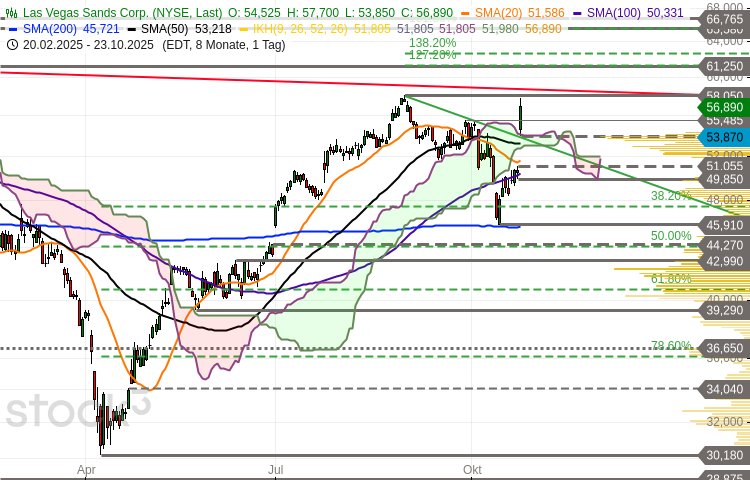 Die Aktie der Las Vegas SandsCorp. (WKN: A0B8S2) hatte im Mai 2023 ein zyklisches Zwischenhoch bei 65,58 USD ausgebildet und etablierte anschließend nach der Komplettierung einer Kopf-Schulter-Umkehr einen Abwärtstrend. Dieser führte die Notierung zurück bis auf ein im April dieses Jahres bei 30,18 USD verbuchtes 3-Jahres-Tief. Die dort gestartete steile Rally beförderte den Wert bis auf im August gesehene 58,05 USD. Damit wurde der 2023 initiierte Abwärtstrend gebrochen. Nach einer mehrwöchigen Abwärtskorrektur bis in den Supportbereich bestehend aus dem 38,2%-Retracement und der 200-Tage-Linie bewegt sich der Anteilsschein seit einigen Tagen wieder nordwärts. Der gestrige explosive und von hohem Volumen begleitete Kursanstieg (+12,39%) nach Veröffentlichung der Quartalszahlen führte zur Überwindung der korrektiven Abwärtstrendlinie. Der charttechnische Fokus richtet sich nun auf die erreichte Widerstandszone bei aktuell 57,71-58,73 USD. Dort befindet sich derzeit auch die ultralangfristige Abwärtstrendlinie vom Hoch im Jahr 2018. Ein nachhaltiger Anstieg darüber per Tagesschluss würde das Bild weiter aufhellen und nächste potenzielle Ziele und Barrieren bei 61,25/61,35 USD, 62,68 USD und 65,55-66,77 USD in den Blick rücken. Mit Blick auf die Unterseite bleiben die Bullen in einer starken Situation, solange die Supportzone bei 53,01-54,02 USD nicht per Tagesschluss unterboten wird. Deutlicher eintrüben würde sich die technische Ausgangslage unterhalb der weiteren Unterstützungsregion 49,85-51,59 USD. In diesem Fall wäre ein möglicher erneuter Test der mittelfristig kritischen Auffangregion 44,27-47,40 USD einzuplanen.