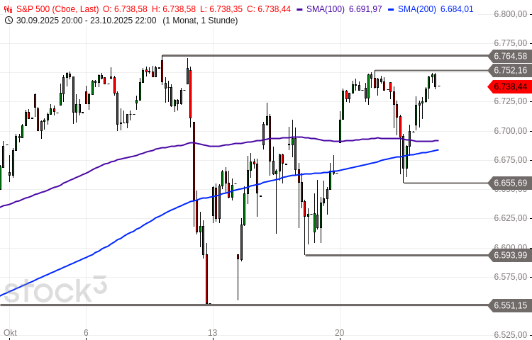 Der S&P 500 vollzog einen Rücksetzer bis auf 6.656 Punkte und zeigte anschließend eine V-förmige Rally. Diese beförderte den Index bis gestern auf 6.750 Punkte. Damit befindet er sich wieder in unmittelbarer Rufweite zum Rekordhoch.