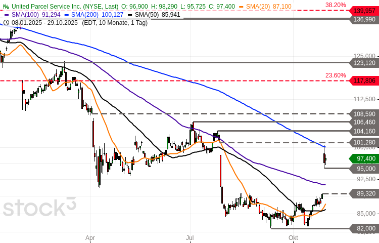 Die UPS-Aktie (WKN: 929198) bewegt sich ausgehend vom im Jahr 2022 bei 233,72 USD markierten Rekordhoch in einem intakten Abwärtstrend. Zuletzt verbuchte sie im September ein 5-Jahres-Tief bei 82,00 USD und testete dort erfolgreich das Corona-Crash-Tief aus dem Jahr 2020. Das darüber zu beobachtende Kursgeschehen stellte eine mittelfristige Bodenbildung dar. Diese wurde mit dem Kurssprung am 28. Oktober in Reaktion auf die Veröffentlichung der Quartalszahlen komplettiert. Die Aktie riss eine Ausbruchslücke und markierte ein 3-Monats-Hoch bei 100,57 USD. Sie erreichte damit ein bedeutendes Widerstandscluster, welches aus der fallenden 200-Tage-Linie und der Abwärtslücke vom 29. Juli resultiert. Im gestrigen Handel formte der Wert einen Inside Day an dieser Barriere. Zur Generierung eines bullishen Anschlusssignals bedarf es nun eines nachhaltigen Anstiegs über 101,28 USD per Tagesschluss. Im Erfolgsfall lauten nächste potenzielle Widerstände und Ziele 104,16 USD und 106,46/108,59 USD. Darüber würde sich auch das längerfristige Chartbild aufhellen mit einer möglichen mittelfristigen nächsten Zielzone bei 117,81/123,12 USD. Ein Rutsch unter den aktuellen Support bei 95,00/95,73 USD per Tagesschluss würde für einen weitergehenden Rücksetzer in Richtung 89,32-91,29 USD sprechen. Darunter würde das derzeit mittelfristig bullishe Bias neutralisiert.