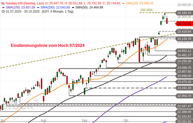Der Nasdaq 100 schraubte sich bis auf ein am Mittwoch bei 26.182 Punkten verbuchtes Allzeithoch hinauf. Ausgehend vom dort befindlichen Ausdehnungsziel starteten Gewinnmitnahmen. Eine an diesem Tag geformte bearishe „Hanging Man“-Tageskerze wurde im gestrigen Handel mit deutlichen weiteren Abgaben bestätigt.
