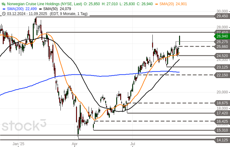 Die Aktie der Norwegian Cruise Line Holdings (WKN: A1KBL8) hatte nach dem Markieren eines 4-Jahres-Hochs bei 29,29 USD im Januar eine kräftige Abwärtskorrektur bis im April gesehene 14,21 USD vollzogen. Hiervon ausgehend weist der Wert wieder einen mittelfristigen Aufwärtstrend auf. Eine mehrwöchige Seitwärtskorrektur oberhalb der zurückeroberten 200-Tage-Linie könnte nun vor dem Abschluss stehen. Im August kam es bereits zu einem bullishen Kreuzen der 50-Tage-Linie mit der 200-Tage-Linie (Golden Cross). Im gestrigen Handel formte der Wert eine lange bullishe Tageskerze und konnte in der Schlusskursbetrachtung ein Mehrmonatshoch erzielen. Im charttechnischen Fokus steht nun die Barriere bei 27,10/27,41 USD, deren Überwindung die Fortsetzung der Rally bestätigen würde. Als potenzielle nächste Zielregion fungiert im Erfolgsfall der Bereich 28,62-29,56 USD. Darüber würde sich das technische Bild weiter aufhellen mit Chancen in Richtung 31,08 USD und 33,95/34,49 USD. Auf der Unterseite befinden sich Supportbereiche bei 26,28 USD, 25,66-25,83 USD und 24,08-24,90 USD. Die nachhaltige Verletzung der letztgenannten Zone würde das derzeit bullishe Bias neutralisieren.