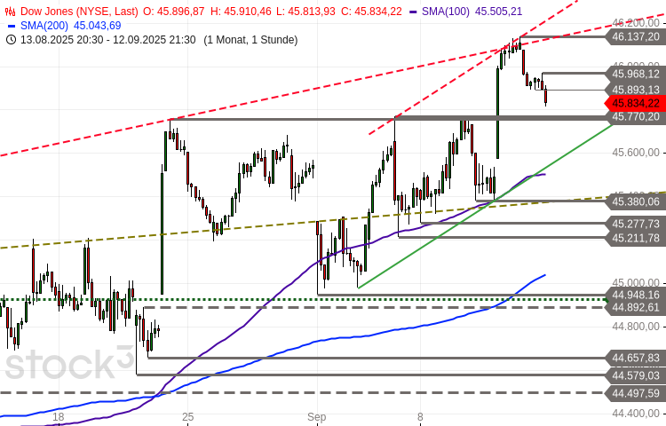 Der Dow konnte bis auf ein am Donnerstag gesehenes neues Rekordhoch bei 46.137 Punkten vorstoßen. Am dort befindlichen Kreuzwiderstand setzten am Freitag Gewinnmitnahmen ein, die den Index bis zum späten Handel auf 45.814 Punkte drückten.