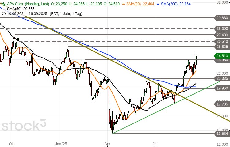 Die Aktie der APA Corporation (WKN: A2QQVE) hatte nach dem Markieren eines Mehrjahreshochs bei 51,95 USD im Juni 2022 einen zyklischen Abwärtstrend gestartet. Ausgehend vom im April dieses Jahres bei 13,58 USD verbuchten Mehrjahrestief meldeten sich die Bullen schließlich zurück. Der Wert konnte einen mittelfristigen Aufwärtstrend etablieren und im August nach mehrwöchiger Konsolidierung die langfristige Abwärtstrendlinie, die 200-Tage-Linie sowie den kritischen Horizontalwiderstand bei 21,34 USD überwinden und somit eine übergeordnete Bodenbildung abschließen. Zuletzt kam es zu einem bullishen Kreuzen der 50-Tage-Linie mit der 200-Tage-Linie (Golden Cross). Nach einem Pullback an die 20-Tage-Linie setzte der Anteilsschein im gestrigen Handel seinen Aufschwung begleitet von hohem Volumen mit einem 8-Monats-Hoch bei 24,97 USD fort. Potenzielle nächste Ziele und Widerstände befinden sich bei 25,83-26,54 USD, 27,48 USD, 28,35 USD und 29,88 USD. Unterstützt ist die Preiskurve als nächstes bei 23,87-23,98 USD und 22,46/22,64 USD. Darunter würde sich das kurzfristige Bild eintrüben mit Abwärtsrisiken in Richtung zunächst 21,34/21,57 USD und eventuell 19,96-20,16 USD.