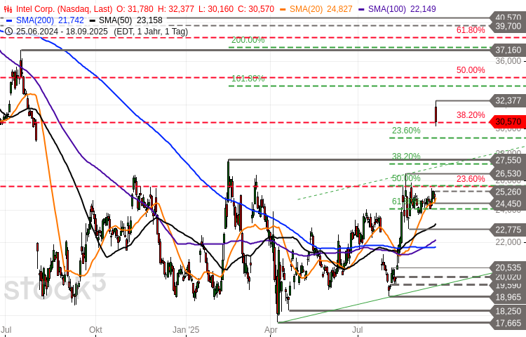 Die Intel-Aktie (WKN: 855681) schlug ausgehend vom im Dezember 2023 bei 51,28 USD verbuchten 21-Monats-Hoch den Weg gen Süden ein. Bis auf ein im April markiertes Mehrjahrestief bei 17,67 USD sackte das Papier ab. Das Kursgeschehen darüber entwickelte sich zu einem langfristigen Boden. Mit der gestrigen Kursexplosion (+22,73%) über die obere Begrenzung (27,55 USD) der seit August 2024 etablierten Handelsspanne wurde dieser Boden begleitet von extrem hohen Volumen komplettiert. Nach dem Erreichen eines 14-Monats-Hochs bei 32,38 USD setzten moderate Gewinnmitnahmen ein. In der kurzen Frist würde eine weitergehende Verschnaufpause nach dem massiven Kursanstieg nicht überraschen. Das übergeordnete Chartbild bleibt bullish, solange der Support bei 25,26-27,55 USD nicht per Tagesschluss verletzt wird. Darüber befinden sich ein möglicher weiterer Auffangbereich bei 29,21 USD. Ein Tagesschluss oberhalb von 32,38 USD würde die nächsten potenziellen Ausdehnungsziele bei 33,66 USD, 34,47 USD, 35,66 USD und 37,16-38,44 USD in den charttechnischen Fokus rücken.