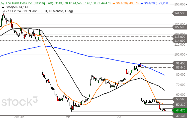 Die Aktie von The Trade Desk Inc. (WKN: A2ARCV) hatte im Jahr 2022 einen Boden oberhalb der Supportzone bei 39,14 USD ausbilden können und haussierte nachfolgend bis auf ein im vergangenen Dezember verzeichnetes Allzeithoch bei 141,53 USD. Dort übernahmen die Bären das Ruder. Der dort gestartete Abverkauf drückte die Notierung bis zum April bis auf 42,96 USD und damit fast zurück an den Ausgangspunkt der vorausgegangenen Hausse. Nach einer kräftigen Erholungsrally bis an die deckelnde 200-Tage-Linie erlitt das Papier im August einen erneuten Schwächeanfall. Mit dem am Freitag bei 43,10 USD gesehenen Tief steht nun wieder das April-Tief zur Disposition. Die Momentumindikatoren befinden sich im überverkauften Terrain. Erste preisliche Bestätigungen für eine technische Erholungsrally wären nun in einem Tagesschluss über 45,54 USD sowie einem Anstieg über die Barriere bei 46,34-46,79 USD zu sehen. Im Erfolgsfall könnten nächste Widerstände bei 49,33-50,21 USD und eventuell 54,00-55,56 USD angesteuert werden. Erst oberhalb der letztgenannten Zone käme es zu einer leichten Aufhellung des mittelfristigen Chartbildes. Ein Tagesschluss unter 42,96 USD würde derweil das Erholungsszenario zunächst negieren und einen unmittelbaren Rutsch an die wichtige Unterstützung des 2022er-Tiefs bei 39,14 USD nahelegen.