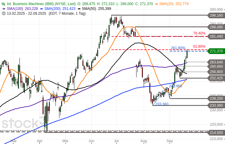 Die IBM-Aktie (WKN: 851399) weist einen intakten langfristigen Aufwärtstrend auf. Zuletzt hatte sie im Juni ein Rekordhoch bei 296,16 USD verzeichnet und war darunter in den Korrekturmodus eingeschwenkt. Ausgehend vom am 12. August bei 233,36 USD markierten Korrekturtief befinden sich die Bullen wieder am Ruder. Die schwungvolle mehrwöchige Rally trifft nun auf das Fibonacci-Cluster bei 271,24/272,17 USD. Eine Verschnaufpause würde an dieser Stelle nicht überraschen. Mit einem signifikanten Tagesschluss darüber würde das Schließen der Abwärtslücke vom 24. Juli mit der Oberkante bei 281,44 USD auf die charttechnische Agenda rücken. Deren Überwindung per Tagesschluss würde weiteres Potenzial in Richtung 288,08 USD und 296,16 USD nahelegen. Mögliche Rücksetzer würden auf potenzielle nächste Auffangbereiche bei 263,23/263,64 USD und 251,42-256,80 USD treffen. Das mittelfristige Chartbild bleibt günstig für die bullishe Perspektive, solange die letztgenannte Zone nicht nachhaltig verletzt wird.