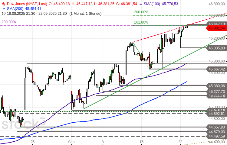 Der Trend bleibt in allen relevanten Zeitebenen aufwärtsgerichtet. Die zu beobachtende nachlassende Schwungkraft, die schwache Marktbreite, das zunehmend euphorische Anlegersentiment und die Gegenwind liefernde Saisonalität machen den Index jedoch anfällig für eine mögliche kurzfristige Schwächephase (Konsolidierung oder Korrektur). Entsprechend sollten die Stops bestehender Long-Positionen zur Gewinnsicherung engmaschig nachgezogen werden. Neue Long-Positionen erscheinen unter Chance-Risiko-Aspekten vorrangig nach einer vorgeschalteten Schwächephase wieder interessant. Nächste Unterstützungen befinden sich bei 46.265-46.317 Punkten und 46.036-46.106 Punkten. Ein Tagesschluss darunter würde eine erste preisliche Bestätigung für eine mögliche Verschnaufpause liefern. Weitere Auffangbereiche liegen dann darunter bei 45.920 Punkten und 45.667-45.777 Punkten. Ein Stundenschluss oberhalb des aktuellen Widerstandsclusters bei 46.428-46.447 Punkten würde derweil für eine unmittelbare Ausdehnung des dominanten Aufwärtstrends mit Zielrichtung zunächst 46.568/46.607 Punkte und 46.700-46.897 Punkte sprechen. Als potenzielle nächste langfristig relevante Zielregion fungiert der Bereich 47.375-48.306 Punkte.