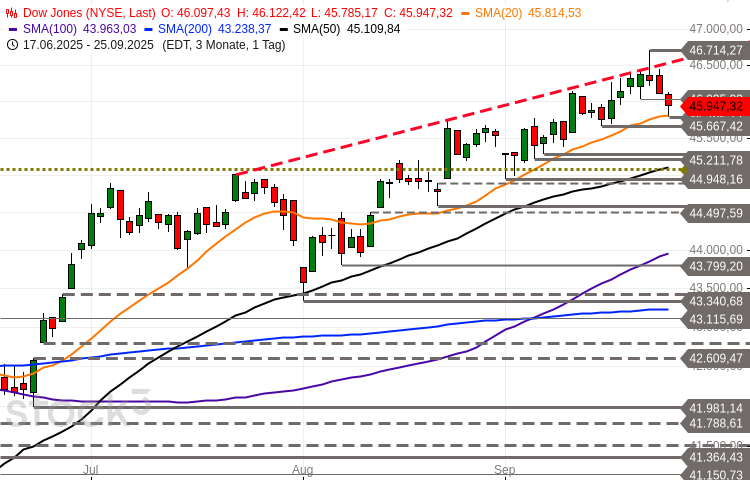 Der Dow Jones Industrial zeigte vom am Dienstag bei 46.714 Punkten markierten Rekordhoch einen drei Tage andauernden Abschwung bis auf 45.785 Punkte. Von diesem 6-Tages-Tief konnte er sich deutlich nach oben absetzen.