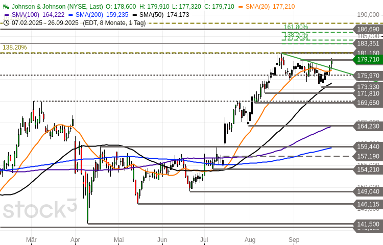 Die Aktie des Pharmakonzerns Johnson & Johnson (WKN: 853260) hatte im April 2022 ein Rekordhoch bei 186,69 USD markiert. Im Rahmen des anschließenden zyklischen Abschwungs rutschte sie bis auf ein im Januar dieses Jahres bei 140,68 USD verbuchtes 5-Jahres-Tief. Einer ersten dynamischen Erholungsrally folgten ein neuerlicher erfolgreicher Test des Januar-Tiefs sowie der laufende zweite Rallyschub. Nach dem Markieren eines 2-Jahres-Hochs bei 181,16 USD im August gönnte sich der Wert zuletzt eine korrektive Verschnaufpause. Seit einigen Handelstagen orientiert er sich wieder ausgehend vom Korrekturtief bei 173,33 USD nordwärts. Am Freitag gelang dabei der Ausbruch über die korrektive Abwärtstrendlinie sowie über das Reaktionshoch vom 5. September. Damit bestehen gute Aussichten auf eine zeitnahe Fortsetzung des dominanten Aufwärtstrends, solange kein Tagesschluss unterhalb des nächsten Supportbereichs 177,21/177,54 USD erfolgt. Potenzielle nächste Hürden und Ausdehnungsziele lauten 181,16 USD, 182,00 USD, 183,29/183,35 USD, 184,15 USD und 186,00-188,10 USD. Unterhalb von 177,21 USD wäre derweil ein weiterer Schwächeanfall mit Zielrichtung zunächst 173,33/174,17 USD einzuplanen.