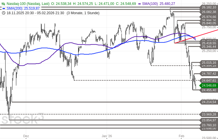 Der Nasdaq 100 orientierte sich in den vergangenen Tagen dynamisch südwärts und brach dabei den Aufwärtstrend vom November-Tief. Er verletzte zudem die gleitenden Durchschnittslinien der vergangenen 50 und 100 Tage. Oberhalb des gestern bei 24.455 Punkten verzeichneten 3-Monats-Tiefs zeigte der Index einen Stabilisierungsversuch.