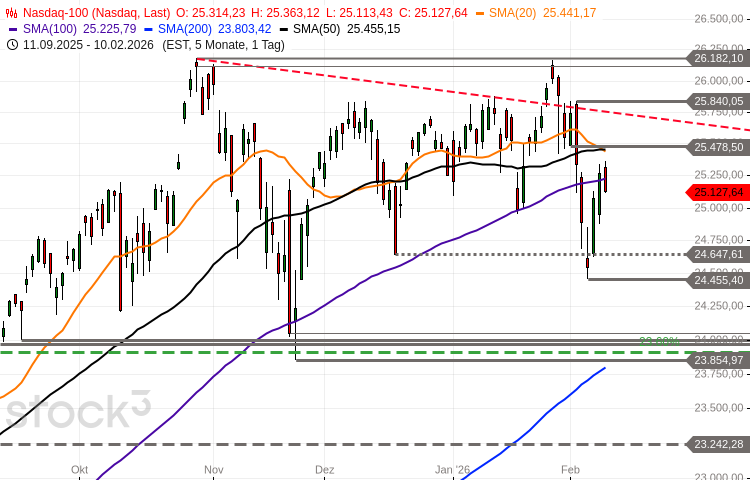 Der Nasdaq 100 konnte sich ausgehend vom Verlaufstief bei 24.455 Punkten bis auf gestern im frühen Handel gesehene 25.363 Punkte erholen. An der dort befindlichen breiten Widerstandszone drehte er südwärts und schloss bei 25.128 Punkten.