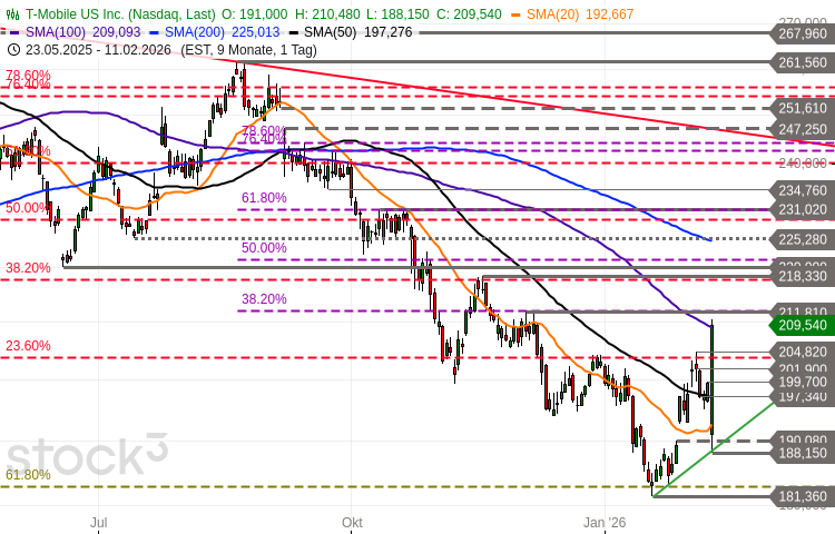 Die Aktie von T-Mobile US (WKN: A1T7LU) war im Rahmen des primären Aufwärtstrends vom Tief des Jahres 2022 bei 101,51 USD bis auf ein im März 2025 bei 276,49 USD markiertes Rekordhoch haussiert. Die nachfolgende dreiwellige Abwärtskorrektur drückte sie bis auf ein im Januar bei 181,36 USD verzeichnetes 2-Jahres-Tief. Dort konnte der Anteilsschein einen Erholungstrend etablieren, der im gestrigen Handel nach der Vorlage der Quartalszahlen mit einer langen bullishen Tageskerze bestätigt wurde. Zugleich wurde ein mehrwöchiger Boden komplettiert. In der kurzen Frist erscheint nun die erreichte nächste Ziel- und Widerstandszone 209,09-212,00 USD kritisch. Ein Tagesschluss darüber würde die Bodenbildung bestätigen und für eine Ausdehnung des Aufschwungs in Richtung zunächst 215,12 USD, 217,70/218,33 USD und 220,00-221,49 USD sprechen. Zu einer deutlicheren Aufhellung des übergeordneten Chartbildes käme es jedoch erst oberhalb der Zone bei aktuell 225,01-231,79 USD, wo sich derzeit auch die fallende 200-Tage-Linie befindet. Mit Blick auf die Oberseite verfügt die Preiskurve über nächste potenzielle Unterstützungen bei 204,82 USD, 201,46 USD und 197,28-199,70 USD. Das kurzfristige Chartbild favorisiert die bullishe Perspektive, solange die letztgenannte Zone nicht per Tagesschluss unterboten wird. Unmittelbar bearish würde es im Fall der nachhaltigen Verletzung der weiteren Supportzone bei 188,15-192,67 USD. Dann wäre ein neuerlicher Test des Januar-Tiefs fest einzuplanen.