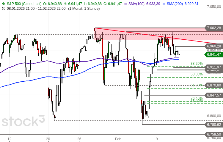 Der S&P 500 testete zur gestrigen Eröffnung die kritische Widerstandszone. Ausgehend vom Tageshoch bei 6.993 Punkten einsetzende Gewinnmitnahmen drückten die Notierung bis auf ein Tagestief bei 6.912 Punkten. Darüber konnte sich der Index stabilisieren und schloss bei 6.941 Zählern.
