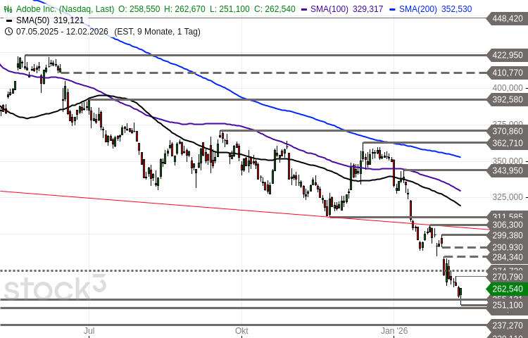 Die Aktie des Softwareunternehmens Adobe Inc. (WKN: 871981) hatte im November 2021 bei 699,54 USD ein Allzeithoch markiert und war nachfolgend bis auf ein im September 2022 gesehenes 2-Jahres-Tief bei 274,73 USD eingebrochen. Die anschließende Zwischenhausse beförderte die Notierung bis auf im Februar 2024 gesehene 638,25 USD. Seither dominieren die Bären wieder das übergeordnete Kursgeschehen. Der jüngste Schwächeanfall drückte das Papier unter das Tief aus dem Jahr 2022 und im gestrigen Handel schließlich intraday marginal unter das Corona-Crash-Tief aus dem Jahr 2020 bei 255,13 USD. Per Tagesschluss konnte dieser Support jedoch dank einer Erholung verteidigt werden. Der Anteilsschein formte bei extrem überverkauften markttechnischen Indikatoren eine Bullish-Harami-Kerze. Damit besteht eine erhöhte Chance auf eine weitergehende Stabilisierung oder technische Erholung, solange kein Tagesschluss unterhalb des Tiefs bei 251,10 USD erfolgt. Mögliche nächste Hürden und Erholungsziele liegen bei 270,79 USD, 274,73 USD und 284,34-290,93 USD. Erst oberhalb von 306,30-311,59 USD käme es zu einer nennenswerten Aufhellung des übergeordneten Chartbildes. Mit einem signifikanten Tagesschluss unter 251,10 USD müsste derweil eine unmittelbare Fortsetzung des Abwärtstrends mit potenziellen nächsten Ausdehnungszielen und Unterstützungen bei 249,10 USD, 237,27 USD, 228,11 USD, 215,15 USD und 204,95 USD eingeplant werden.