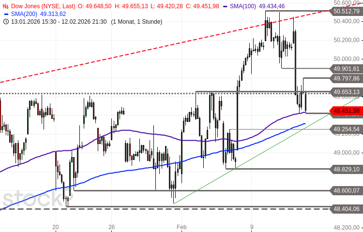 Per Tagesschluss endete er wieder knapp in der am 6. Februar nach oben verlassenen mehrwöchigen Trading-Range. Das kurzfristige Chartbild hat sich leicht eingetrübt. Der übergeordnete Aufwärtstrend bleibt bislang ungefährdet. Nächste Unterstützungen befinden sich bei 49.420-49.434 Punkte und derzeit 49.366 Punkten (steigende 20-Tage-Linie). Darunter käme es zu einer deutlicheren Eintrübung des kurzfristigen technischen Bias mit Abwärtsrisiken in Richtung 48.829-48.909 Punkte und Zwischenetappen 49.255-49.314 Punkte und 49.189 Punkte. Eine Erholung vom aktuellen Support würde auf mögliche nächste Hürden bei 49.678 Punkten und 49.787-49.838 Punkten treffen. Leicht aufhellen würde sich die kurzfristige Ausgangslage mit einem Stundenschluss über der weiteren Barriere bei 49.902-50.004 Punkten. Im Erfolgsfall lauten nächste Ziele und Barrieren 50.095 Punkte und 50.248-50.279 Punkte.