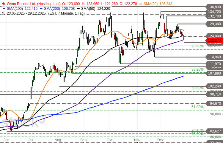 Die Aktie des Casinobetreibers Wynn Resorts (WKN: 663244) weist einen intakten langfristigen Aufwärtstrend auf. Auf Jahressicht konnte sie um rund 42 % zulegen. Mit Blick auf das mittelfristige Chartbild korrigiert der Wert derzeit den Aufschwung in einer Seitwärtsbewegung unterhalb des bei 134,72 USD markierten 4-Jahres-Hochs. In der kurzfristigen Betrachtung zeigt er aktuell eine zweite Abwärtswelle, die die Notierung im gestrigen Handel unter die gleitenden Durchschnittslinien der vergangenen 50 und 100 Tage auf ein Mehrwochentief drückte. Ein bestätigender Tagesschluss unterhalb des Supports bei 121,09/121,26 USD würde weitere Abgaben in Richtung zunächst 118,33 USD und 114,96-116,00 USD nahelegen. Weitere mögliche Auffangbereiche lassen sich bei 110,63/111,97 USD sowie derzeit 106,71-108,18 USD ausmachen, wo sich unter anderem die steigende 200-Tage-Linie befindet. Ein erstes prozyklisches Indiz für einen zeitnahen erneuten Angriff auf die übergeordnet bedeutsame Ziel- und Widerstandszone 132,79-136,83 USD entstünde mit einem Tagesschluss oberhalb der nächsten Barriere bei aktuell 124,04-126,34 USD. Saisonal verfügt das Papier derzeit über Rückenwind. Laut Seasonax konnte es in den vergangenen zehn Jahren neun Mal im Zeitraum vom 30. Dezember bis zum 19. Februar Zugewinne verbuchen. Die Durchschnittsrendite des Musters betrug 10,74 % (Median: +9,21 %).